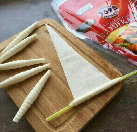 اول خمير هاي يوفكا را به صورت مثلث هاي باريك برش مي دهيم و از قسمت قاعده ي مثلث دور يك ني به سمت راس مثلث رول مي كنيم.