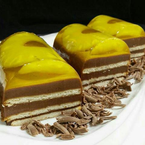 و کمی که خنک شد. از مواد یک لایه روی ژله ریخته و بیسکوییت میچینیم و به همین ترتیب تا مواد کامل در قالب ریخته شود. سپس ۵ ساعت در یخچال قرار داده تا کامل سفت شود. بعد از قالب برگردانده و برش میدهیم.